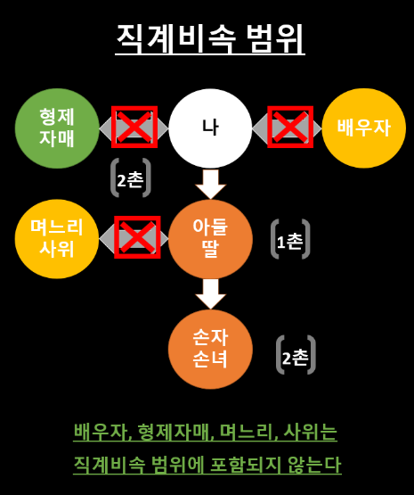 - 직계존비속: 자신을 중심으로 직선으로 연결되는 가족 관계(부모, 조부모, 자녀, 손자녀 등)
